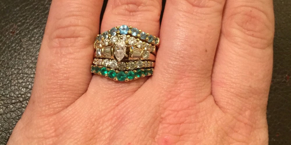The Emerald band represents our son, our firstborn, conceived a month after my husband returned home. The Blue Topaz band represents our daughter, only 18 months younger than her brother. They were fashioned so we could add as many as the Lord so chooses… 😀